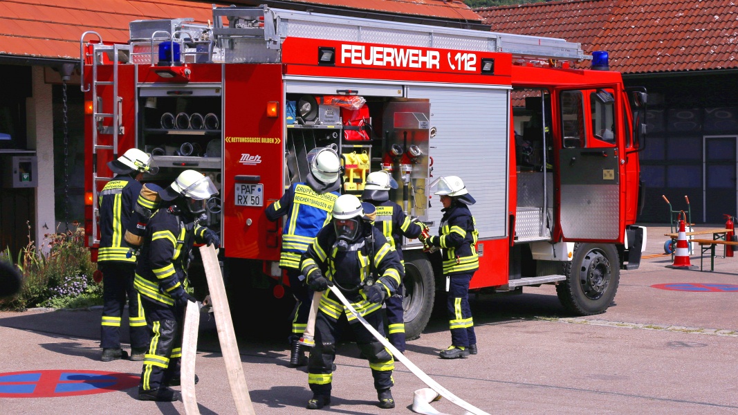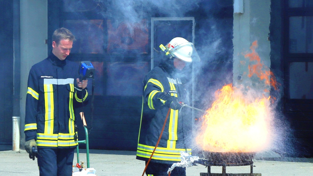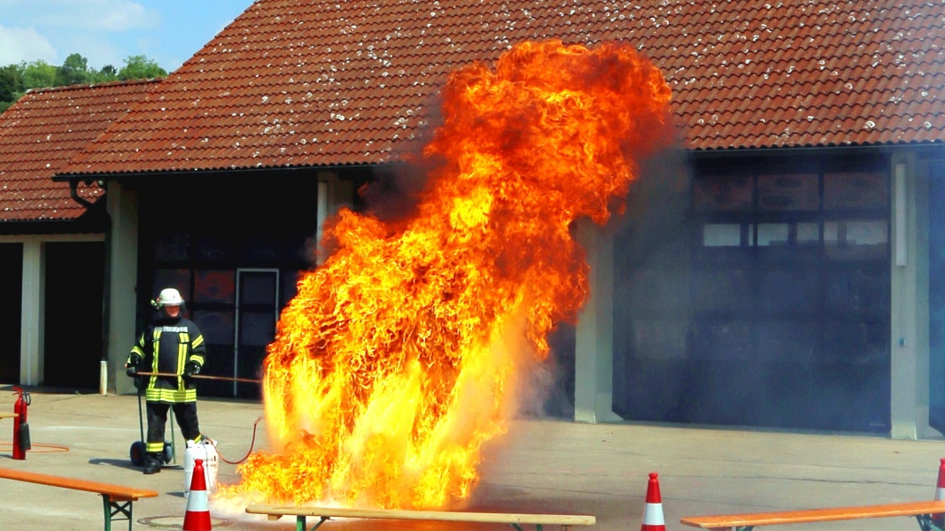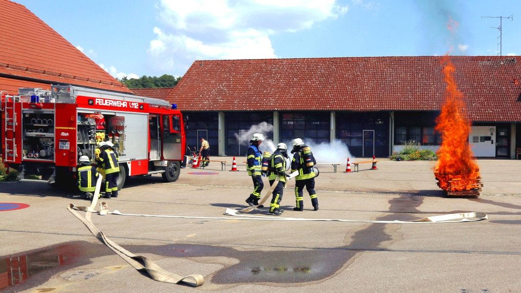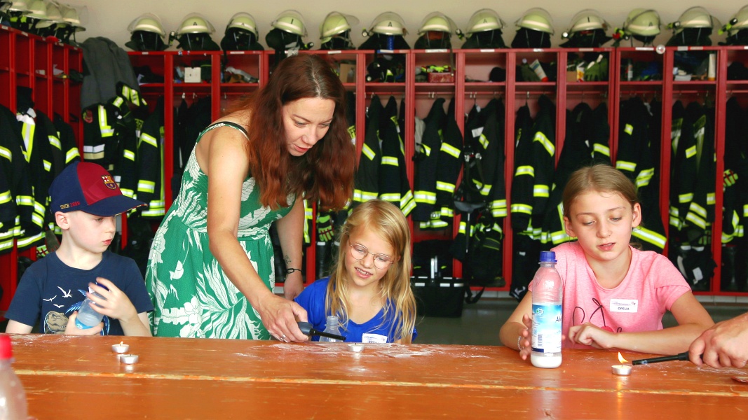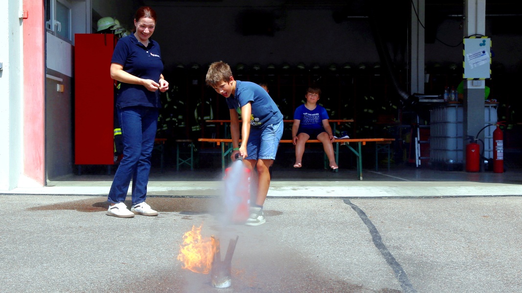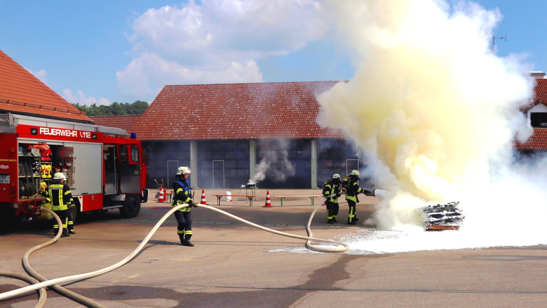 Am Nachmittag durften die Mädchen und Buben dann mit echtem Löschgerät und Wasser aus einem unserer Einsatzfahrzeuge einen weiteren Brand löschen. Im Anschluss demonstrierten unsere Kameraden aus der aktiven Wehr einen Löschangriff mit Schaum unter Atemschutz. Beeindruckend war auch die Vorführung einer Fettexplosion, bei der gezeigt wurde, welche gefährlichen Folgen der Einsatz von Wasser – hier das falsche Löschmittel – bei einem Fettbrand haben kann.