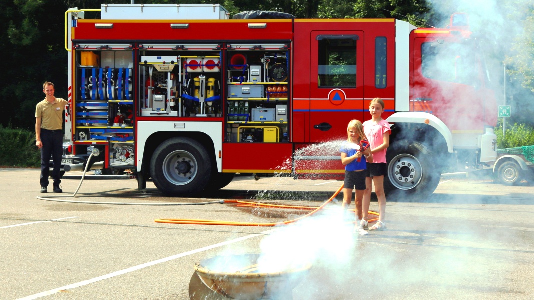 Im weiteren Verlauf des Vormittags konnten die Kinder unter fachkundiger Anleitung selbst Feuer löschen. Dabei erfuhren sie viel Wissenswertes über die Ausrüstung, die Einsatzbereiche und die Aufgaben der Feuerwehr.