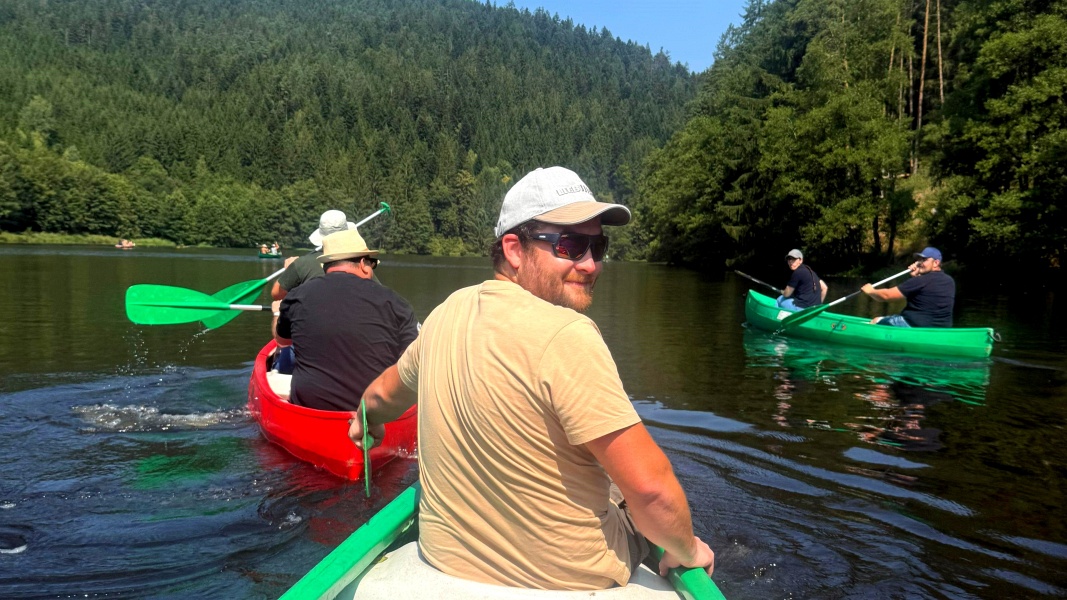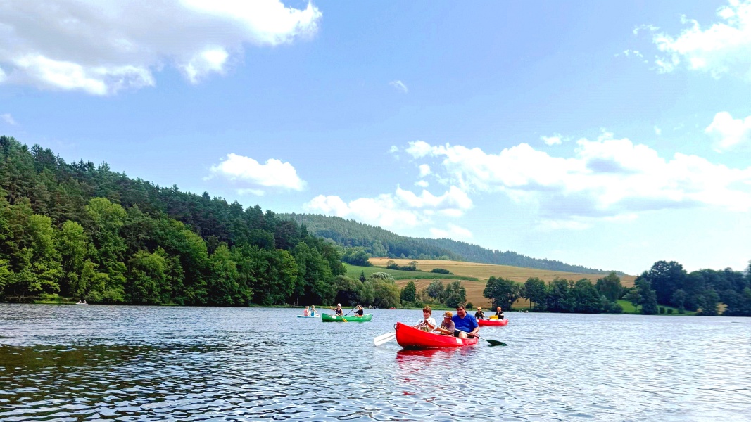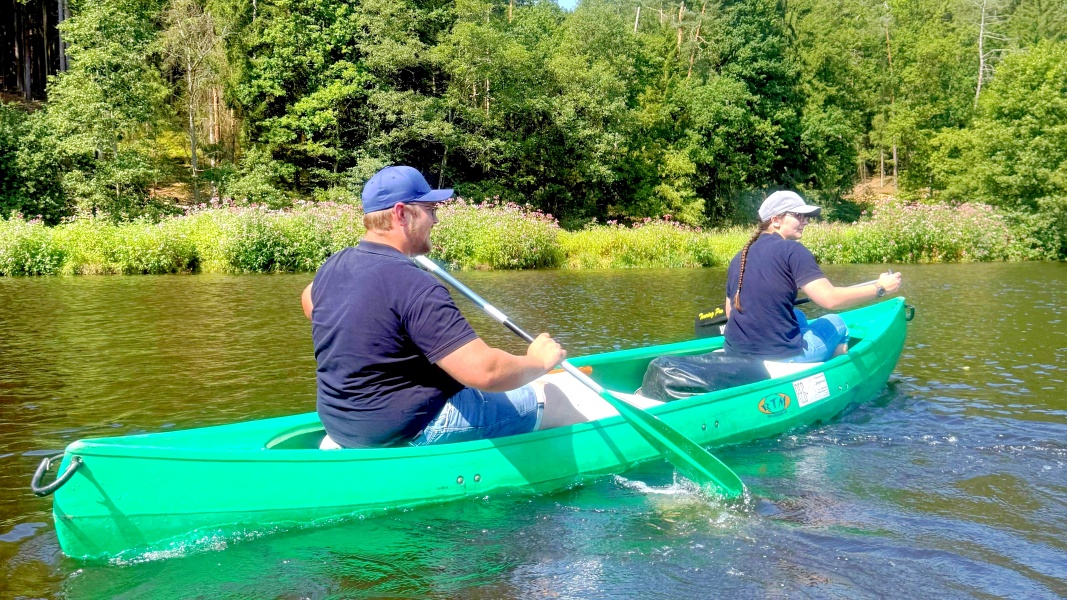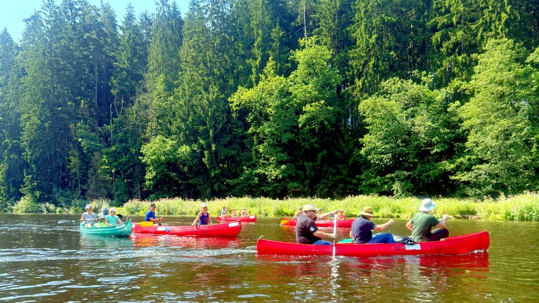 Dort mieteten wir Boote, um den schwarzen Regen flussabwärts zum Blaicher See zu paddeln. Mit 8 Kanus hatten wir bei hochsommerlichen Temperaturen viel Spaß auf der 14 Flusskilometer langen und landschaftlich sehr schön gelegenen Strecke.